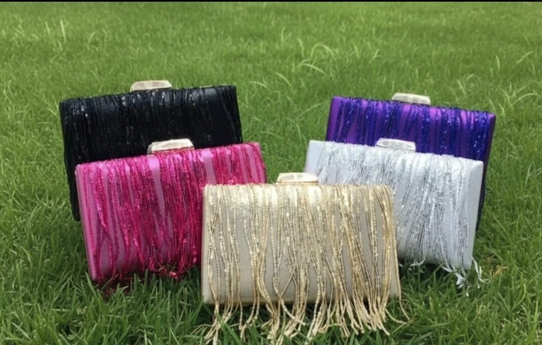 Bolso de evento con detalles metalicos y flecos en diferentes colores