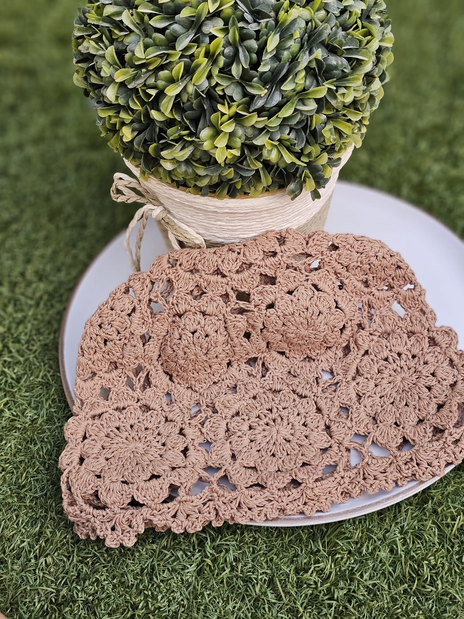Gorros de ganchillo elaborados con hilo, textura calada y borde ondulado.